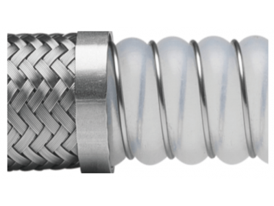 淺波紋設計的PTFE軟管Croflex?,符合FDA食品和USPVI制藥級要求,加螺旋鋼絲和不銹鋼編織網增強。淺波紋對流量的影響很小,更易于排水和清洗,適合潔凈物料的輸送和抽吸。Croflex?軟管耐高溫,耐強腐蝕,加厚PTFE帶來更強的抗滲透性,使工作壽命延長。可將PTFE翻邊于接頭密封面,防止物料對PTFE以外物質的腐蝕風險。中層螺旋鋼絲環繞在PTFE軟管波紋處,可有效防止折癟,并可增強高溫下耐負壓能力。